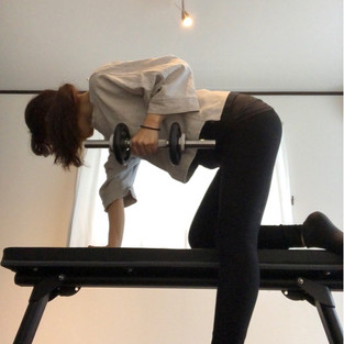 ダンベルを持ち、脇をしめながら、自分の肩甲骨を真ん中(背骨)へ引き寄せるように動かします。そして、肩甲骨と背骨の間にある菱形筋などを刺激していきます。